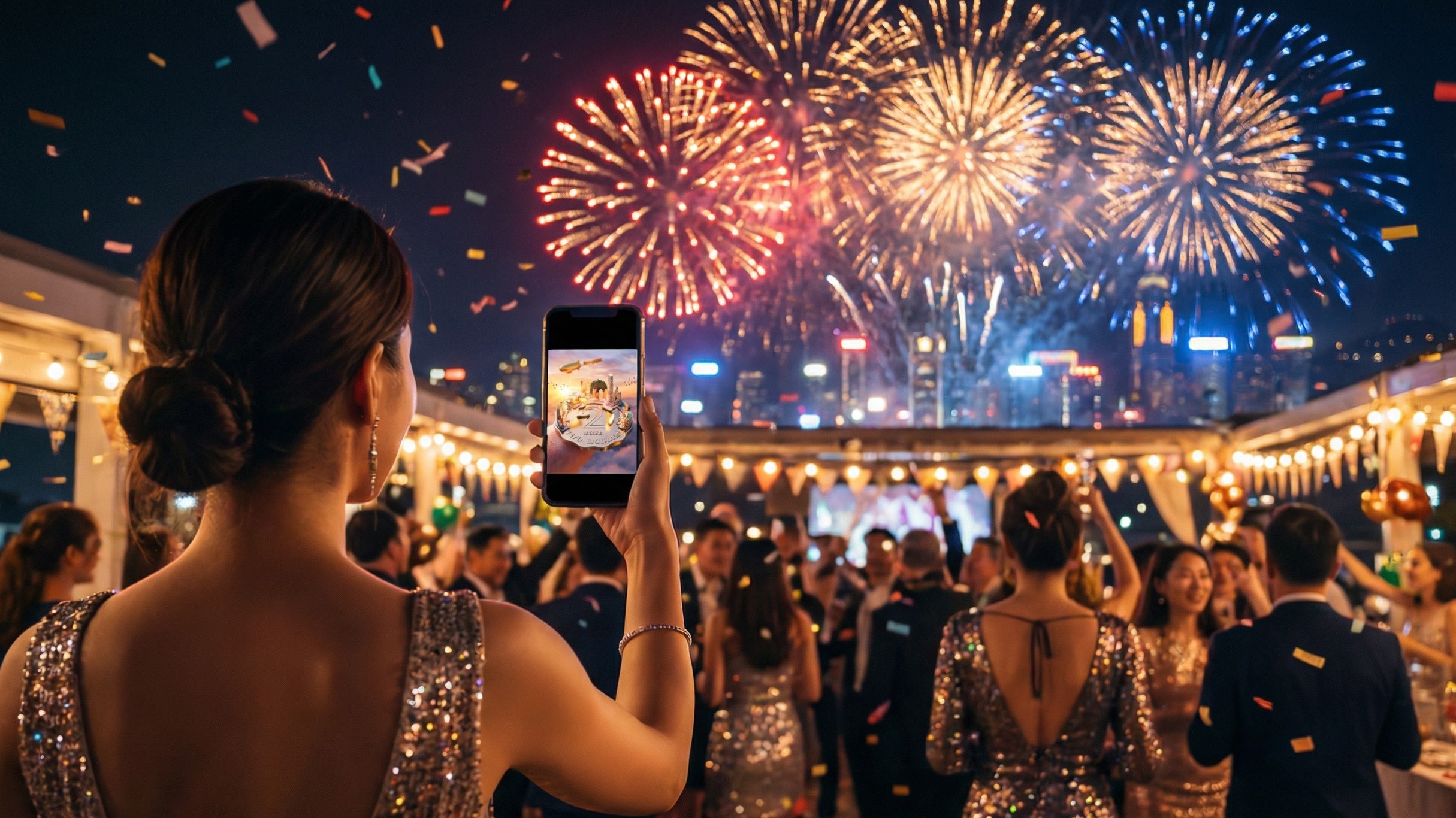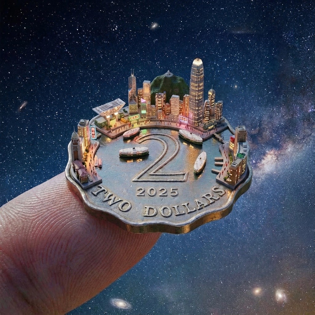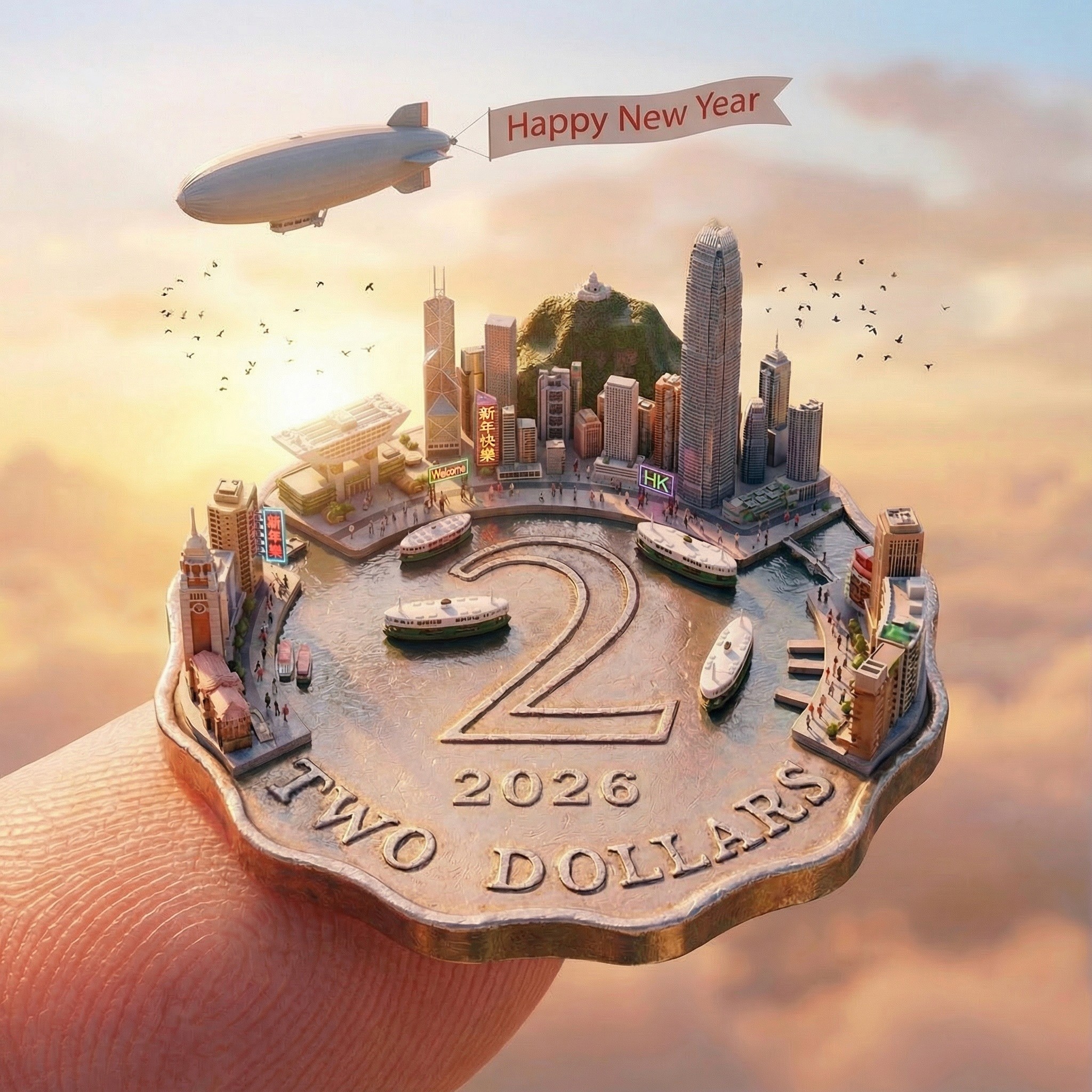 A miniature urban world rising from a currency coin. The design captures the transition from a dark, cosmic night to a bright, optimistic dawn, while weathered coin morph into a shinny 2026 featuring a dirigible trailing a "Happy New Year" banner over a golden horizon.